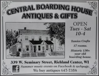 Central Boarding House Antiques is open in early April to Christmas week. Check with us for current hours. An ever changing Treasure Hunt in our Historic 130+ year old Central Boarding House in downtown Richland Center. 17 rooms and spaces to enjoy.