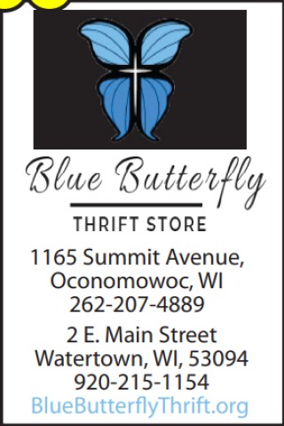 Blue Butterfly Thrift Stores in Oconomowoc & Watertown strive to repurpose lightly used clothing, small furniture and house-ware products through our faith-based retail store. Our mission is for residents of Oconomowoc and the surrounding areas to have access to good quality, affordable products, in a clean, comfortable, Christian atmosphere. Profits that are generated from these sales are given to Alpha Resource Center, Christian Family Solutions (WLCFS) and Tomorrow's Choice, working together to support primary ministry areas that relate to the sanctity of life, mental health counseling, and senior care services.